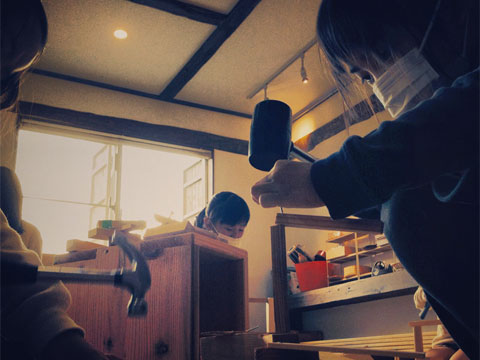 まぁ何かためしに作ってみようってんで、木片と釘とカナヅチでトントンやってみるわけです。アヤ子先生は釘とかカナヅチとか縁のない人なのですが、作りたい気持ちがいっぱいの人なもんで、けっこうな勢いでガンガンいっちゃいます。そばで見ていて怖いこと…指を叩かないかこっちがヒヤヒヤでした。