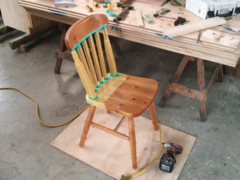今回ご紹介した修理方法は、比較的簡易的な方法です。木の椅子って本当はがっちり固定しない方が良いのです。木と木の接合部が微妙に動くことによって、力を逃がす作用もあるんですね。がっちがちに固めてしまうと、予期せぬ大きな力が加わった時にボキッといってしまう可能性が大きくなります。ですから、本来でしたら元々と同じ部材を削り出しての修理がベストだと思います。