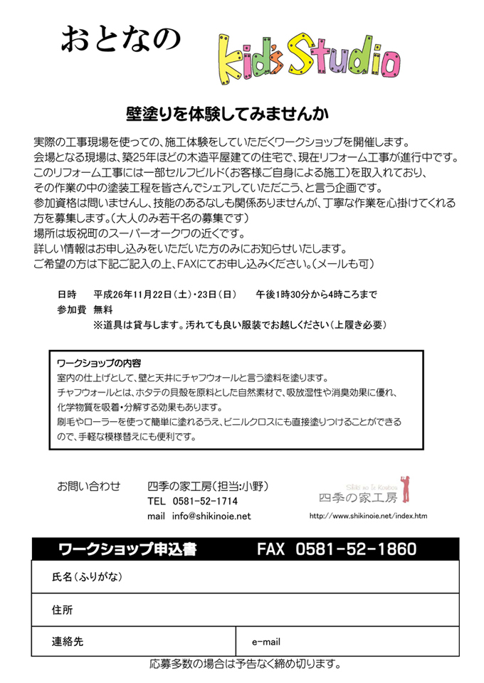 11月の三連休前半の22日、23日を利用して、壁塗りワークショップ「大人のキッズスタジオ」を開催いたしました。本来だったらその前の週に予定していたのですが、どうしても現場の進捗の方が間に合わなくて…一週間遅らせての開催となりました。15日、16日で予定されていた方には大変申し訳ありませんでした。この場を借りてお詫び申し上げます。