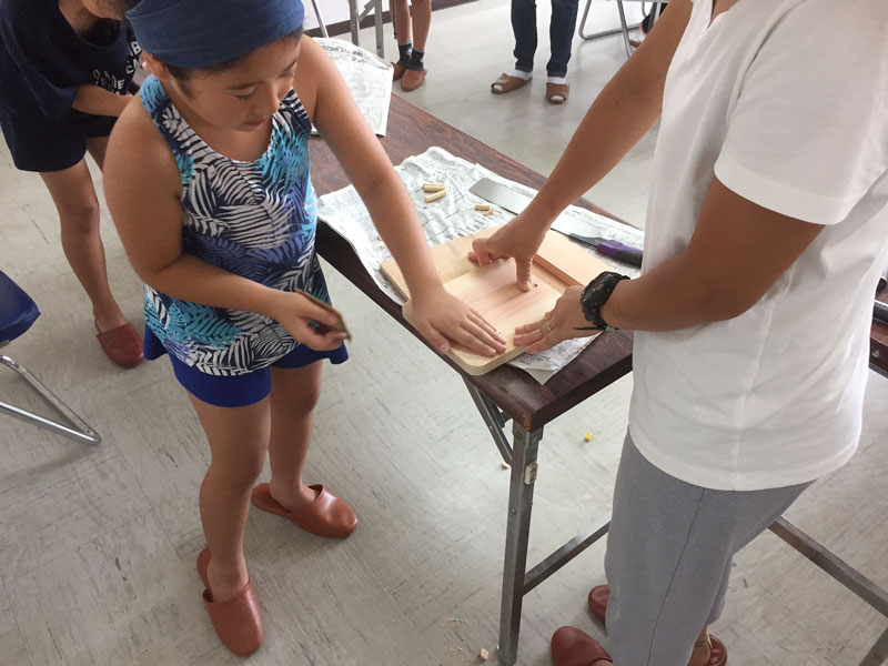 「キッズスタジオ」が実際はどういうイベントかと言いますと、僕たちのような建築業に携わる者たち…大工、左官屋、電気屋、水道屋、内装屋などプロの職人たちに集まってもらって、「実際の仕事の一端を経験してもらおう」というのがコンセプトです。実際に使用する材料を、本物の道具を使って作業するので、子供たちにとっては初めて手にする道具の重さとか職人の手の使い方なんかを直接体験できるのです。