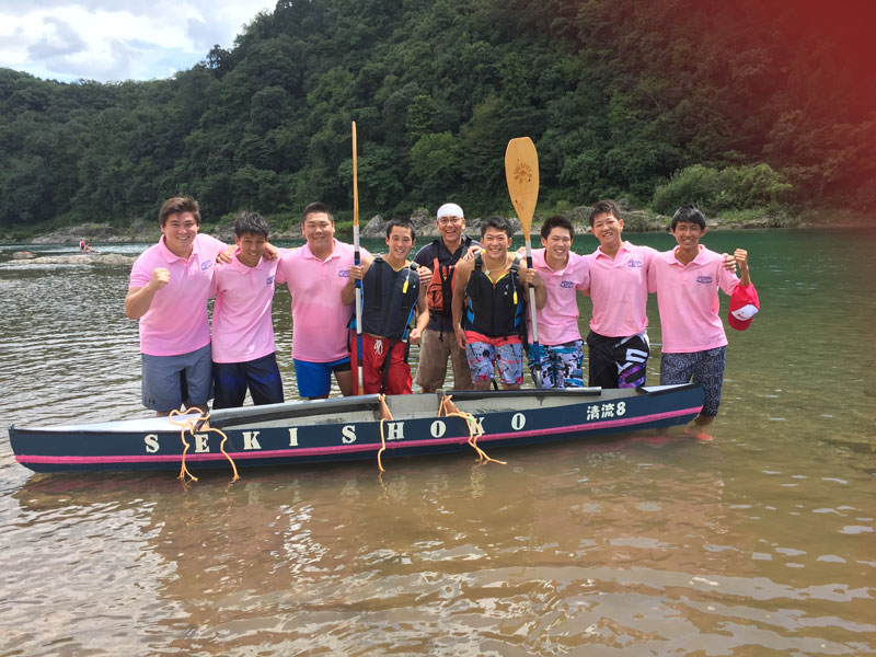 さて、4月からコツコツと制作を続け、この8月に完成、進水式、そして大会に向けた練習を行うのですが、完成から大会までの期間もあまりないもんで、この日の練習が2回目であり最終練習でもあります。漕ぐのは体育会系の部活で鍛えた二人で、パワー重視のエンジン係の前座はラグビー部、艇の方向舵としてレースをゲームメイクをしつつパワーも要求される後座には野球部からの人選で、なかなかチームワークも良いです。
