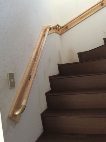 木板を取り付けるとこんな感じです。ここまでできると工事は7割終わった感じです。あとは順番に手摺りと手摺り金具をとりつけていけば、手摺り工事の完了です。「階段がすごく楽になった〜!」と喜んでいただきました。