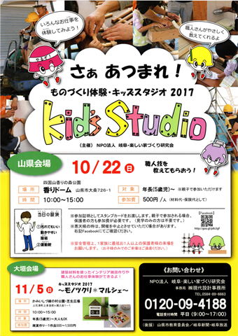 四季の家工房は山県会場の全体運営と大工ブースを3つ、大垣会場でも1ブース担当しています。たくさんのちびっ子の参加をお待ちしています!!とくに申し込み等は必要ありませんが、何かご不明の点がありましたらチラシのフリーダイヤルにかけていただくか、四季の家工房まで直接メールでお尋ねください。