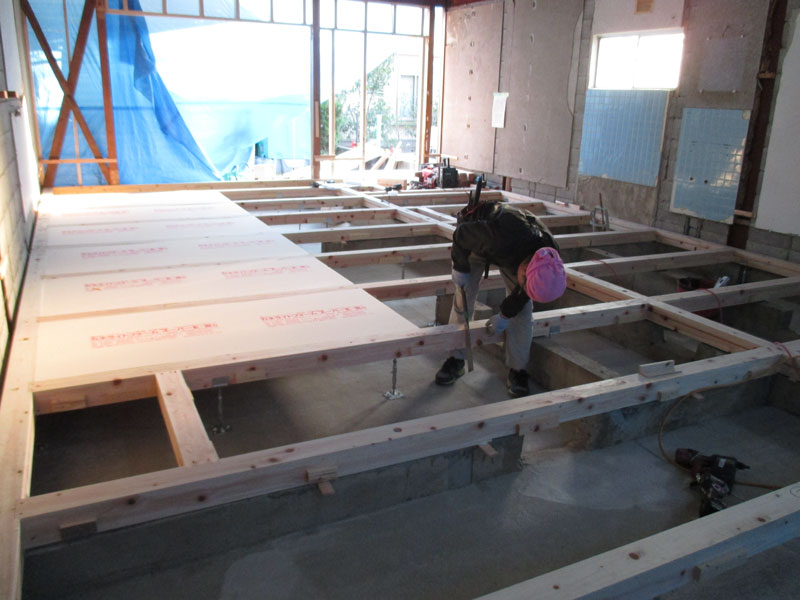 まずは、建物内部を全解体して、新たに床を組みなおします。床には断熱材として6センチ厚のスタイロフォーム(押し出し方ポリスチレンフォーム3種)を敷き詰めて床下からの底冷えをカットします。
