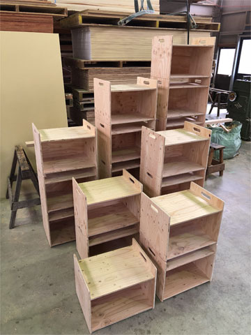 こんなの作りました。これ…サイズが約40センチ程度の箱で、一つ一つの箱に持ち手が付いています。箱の底部ははめ込めるような形状になっていて、上下を組み合わせて使うこともできるようになっています。何に使う箱かと言うと、講演会やイベントでチラシや書籍などを置くための箱でして、搬入搬出時の持ち運びやすさと、そのまま展示できる便利さを兼ね備えた箱なのです。もちろん、普段はそのまま積み重ねておけば、通常の書棚としても利用できます。