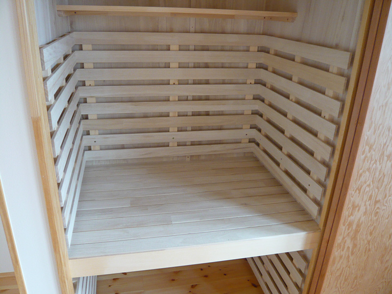 子供が小さいうちは家族全員畳の間で眠ります。南北に大きな開口があるので、採光や通風もたくさん取り込めます。押入内部は桐板張りです。布団収納部分には中段も桐スノコとし、さらに壁面にも桐で作ったスノコを取り付けてあります。
