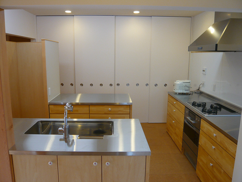 キッチンはオリジナルです。木製の引き出しキャビネットにステンレスのワークトップをはめてあります。アイランド状のシンクと作業台、コンロ部をそれぞれ独立させ、大勢でキッチンを囲めるような配置になっていますが、日常的に使用する主な作業動線は短く抑えてあります。