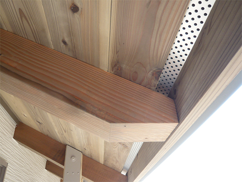 又、準防火地域に指定されていますので、軒裏に木材をあらわすために3cm厚の杉の地板と4.5cmの面戸板(軒桁の上の隙間を塞ぐ板)を使用しています。