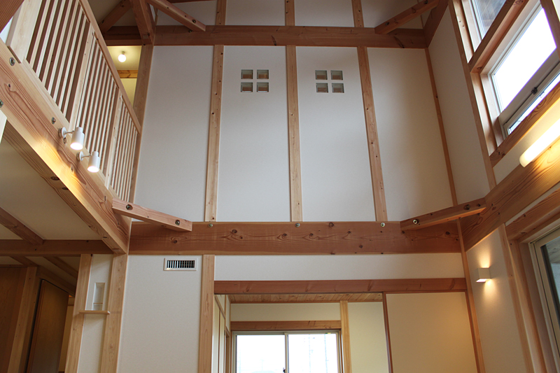 リビング吹抜け右手がMaHAt(マッハ)システムの空調室です。エアコンを取り付けた約畳2枚分のスペースから、各部屋にダクトが伸びていきます。