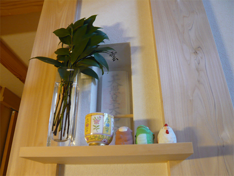 一枚板には割れや虫食い跡など何らかの欠点があるものですが、蝶型のチギリを入れて欠点もデザインにしてしまいました。