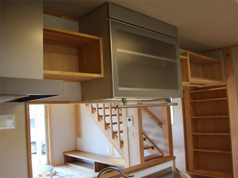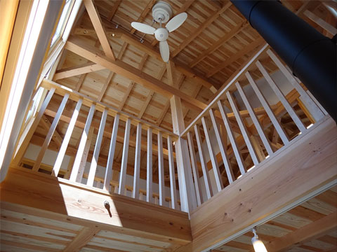 ストーブ上部は吹き抜けになっていて、暖かい空気が家全体に回るようにシーリングファンで撹拌します。シーリングファンには昇降装置を取り付けてありますので、掃除の時には2階レベルまで降ろすことができます。