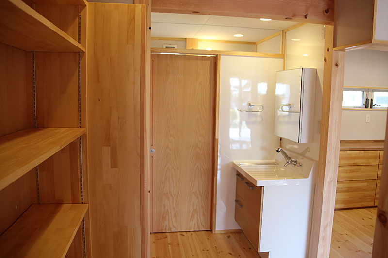 もう一つの特徴として、玄関からの通り土間を設け、直接キッチンへ行ける動線を作ってあります。この通り土間は食材の搬入やゴミ出しの動線であると共に、パントリーの役目も持たせてあります。
