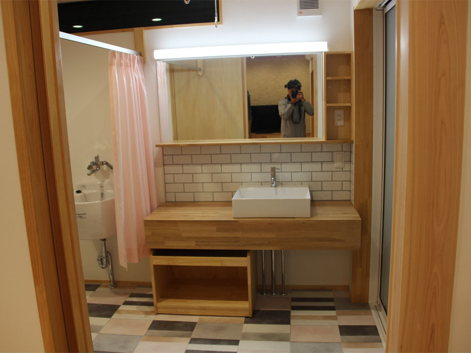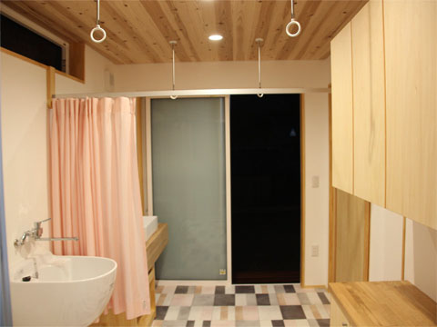 脱衣室と洗面所はピンク色のカーテンで仕切られています。脱衣室には洗濯機スペース、マルチシンク、衣類収納棚などが設置されており、入浴時の安全と室内干しを兼ねてエアコンも設置しました。天井から吊られた輪っかは、物干し竿を通すホスクリーンです。