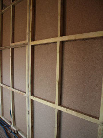 下地も終わり、麻のボードをはめ込んでいきます。このボードは、使い古した手鋸で結構簡単に切ることができますが、切りクズが出るのでそれは隙間に押し込んでおきます。隙間なくピッチリ入れていくことで防音効果はかなり期待できます。ここのところは晴れる日もなく雨ばかりが続きみんな元気がない様子…僕もあまり元気が出ませんでした。