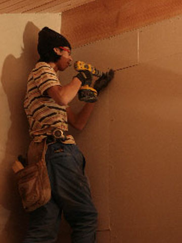 下地や壁の中の作業も終わったので、いよいよボードを張り始めていきます。日曜ということで子供たちも総出で作業に取りかかりました。素材は石の粉と紙を固めたFermacellというもので、サイズは1200mm×1000mm×12mmもあります。これ実はものすごく重くて、2枚重ねると1人で運ぶのは困難…1枚でもなんとか1人で汗をかきながらの作業で、腕と腰はパンパンに張ってしまいました。