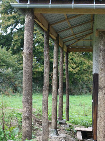 軒はこんな感じで出来ていました。軒に使ってある柱は森から選んで伐ってきた西洋栗(山栗になるのかな?)の皮を剥いただけで、枝の部分があったり曲がっていたり太さもバラバラ…でもこれがホントにいい感じだと思いました。なんと言うか、確かに同じ太さで揃っていたり、きれいに削ってあるときれいですが、でもこの軒もきれいだと思いました。