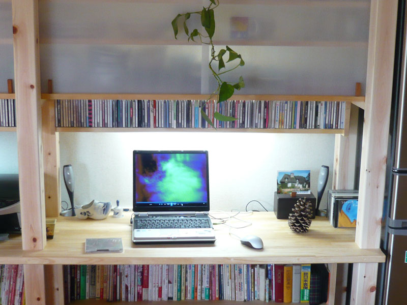 CDラックの後ろ側には20Wの蛍光灯をつけました。CDケースを活かして、並べたCDケース自体をひとつの照明器具に見立ててあります。