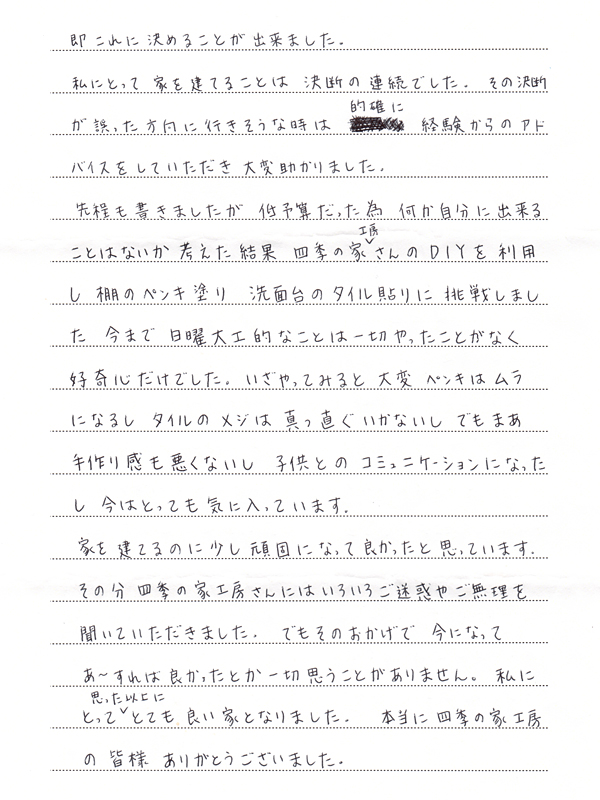 私にとって家を建てることは決断の連続でした。その決断が誤った方向に行きそうな時は、的確に経験からのアドバイスをしていただき大変助かりました。