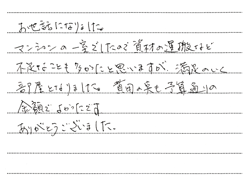 お世話になりました。マンションの一室でしたので、資材の運搬など不足なことも多かったと思いますが、満足のいく部屋となりました。